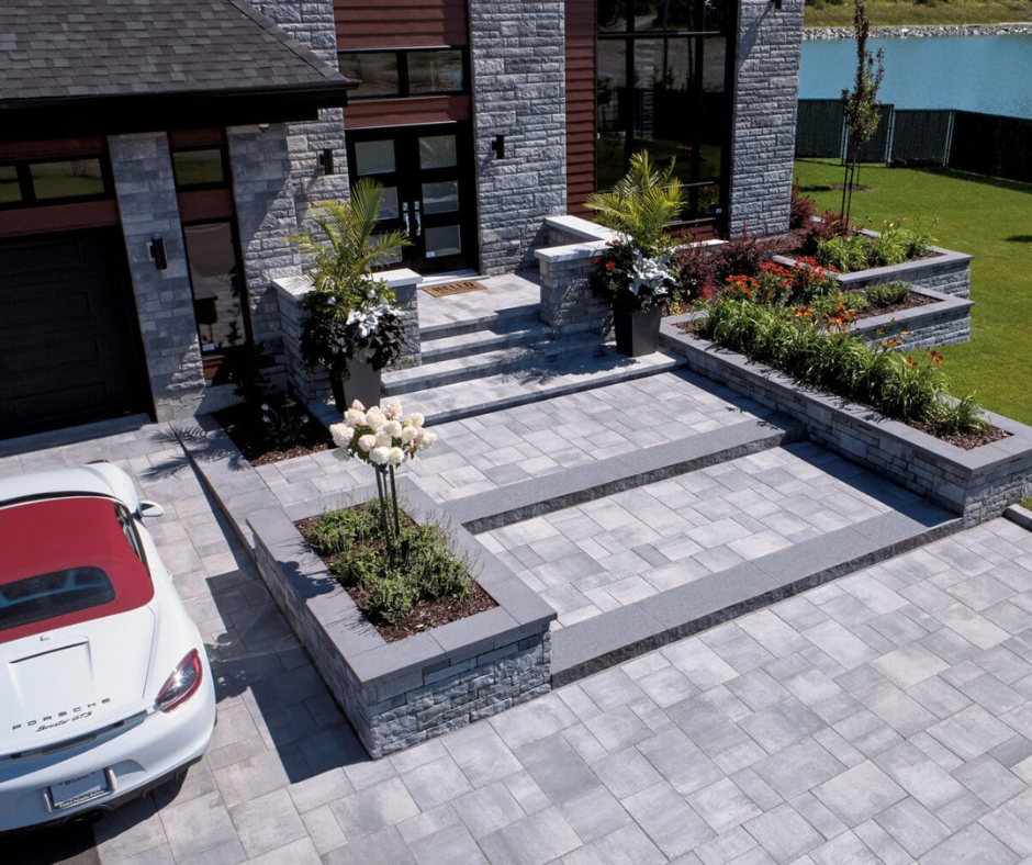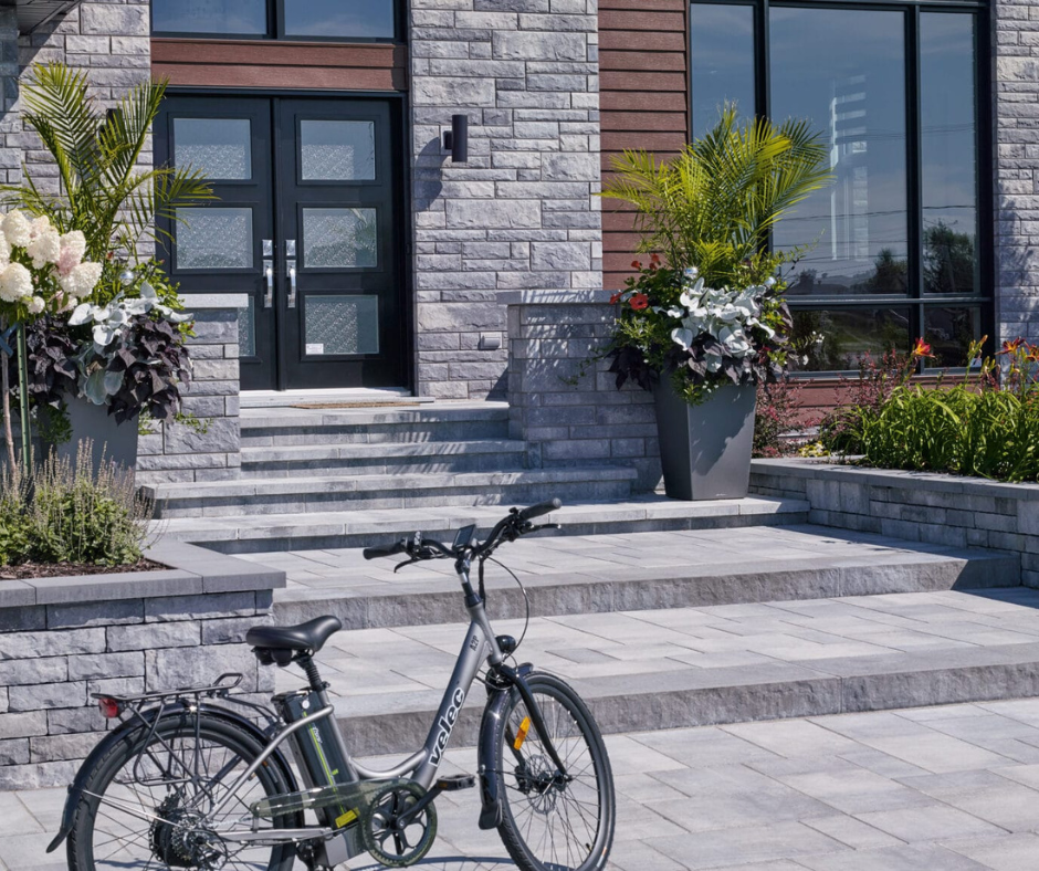 Notre imposante marche en béton sec Méga Lafitt Plus® à l’aspect de pierre calcaire donne un caractère unique aux allées piétonnes. Grâce à ses couleurs durables, sa stabilité dimensionnelle et sa texture unique offrant une jonction parfaite, cette marche complète à merveille tout aménagement.
